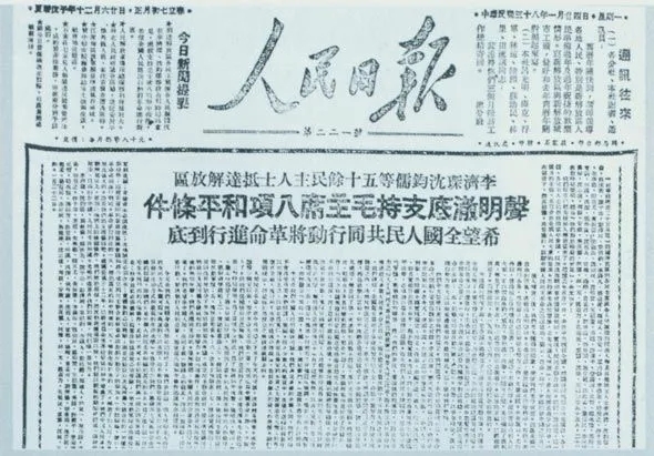1949年1月22日,李济深、沈钧儒等55人联名发表对时局的声明,拥护毛泽东提出的八项和平条件。这是《人民日报》的有关报道。
